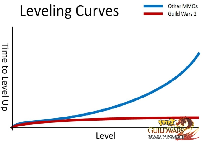 GW2封顶级数为80级,这方面Anet维持一贯创新精神,放眼所见市场上所有MMO的升级难度会随等奴上升要几何级数增长,但GW2的升级曲线却是非常平坦,初期升级难度会一点一点的提升,但很快这增长就会停止,每一级的升级难度都会维持在同一水平,Anet就是要反对那种要耗费大量时间升级的折磨游戏,游戏的目前不应该是升级。他们说过一个正常玩家从30级要升到31级大约需要90分钟时间,而这之后的每一级也是同样时间,所以你由79级升到80级大约也只是90分钟而已。