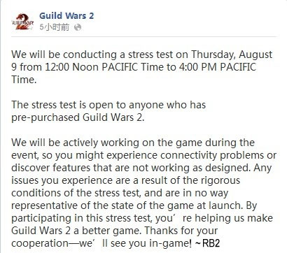 ArenaNet官方的Facebook发布消息称将会在太平洋时间8月9日12点到4点(北京时间8月10日凌晨3点到7点)再进行一次压力测试: