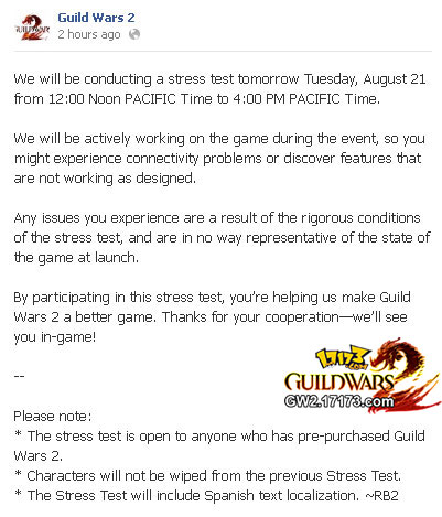 激战2官方宣布了下次压力测试的具体时间:美国太平洋时间8月21日周二的中午12点,测试持续4小时。