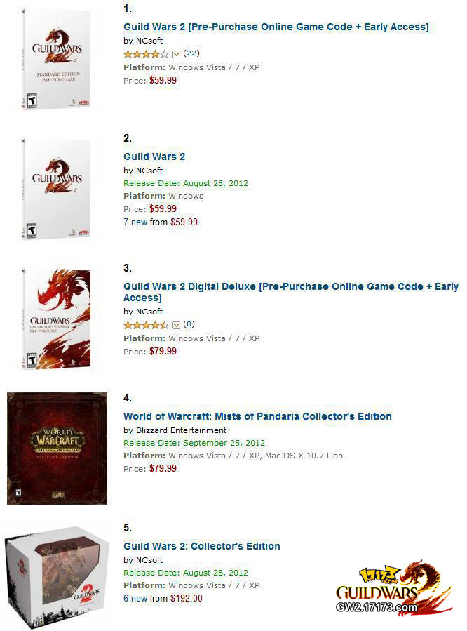 不是第三名,对,你没有看错,是第一名,第二名,第三名全部被激战2包揽。这个是Amazon.com上面最畅销游戏榜单的截图,荣获第一名的是激战2预购数字版,第二名是普通数字版,第三名是豪华数字版,第四名是朋友们必定非常熟悉的魔兽世界:潘达利亚的迷雾典藏版,第五名,还是激战2!是它的典藏版。激战2一举囊括前五名其中的四名,你值得拥有。
