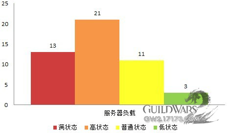 《激战2》美服25日开服伊始,所有的服务器都处于一个高负载状态,甚至有几个比较火爆的服务器达到了满员状态,不再接收新玩家的加入,要知道能提前进入游戏都是预定了正式CDKEY的玩家,而还有一批购买了CDKEY的玩家在眼巴巴的等着28号的正式开服,截止目前《激战2》共开放了45组服务器,其中北美服务器21组,欧洲服务器24组,满负载状态服务器13组,高负载状态服务器21组,普通负载状态服务器11组,低负载状态服务器2组。