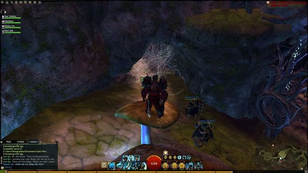 干掉BOSS后选择UP路径,这里就是蜘蛛混战,比较麻烦,但不麻烦的是,有一个对于元素和远程职业的有利地点。如下图,但不能持续太久。因为上面稍微打一会所有的远程攻击都会偏失,但没关系,因为前面还有好几拨蜘蛛等着你,所以即便你不能杀死他们,你还可以在蘑菇上等重置,去一个一个救队友,只要你站在蘑菇上,你就是绝对安全的(对方远程除外。)