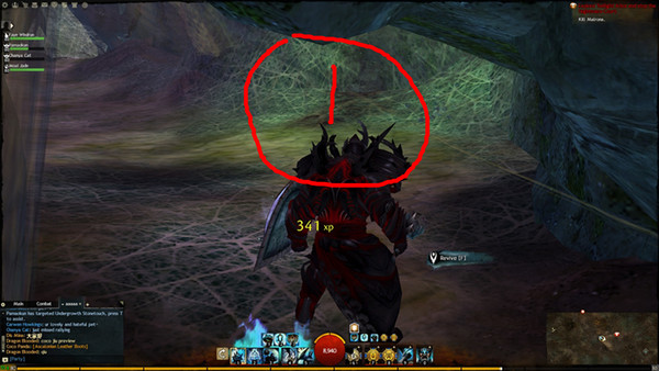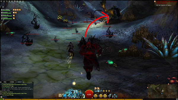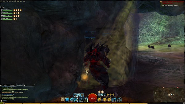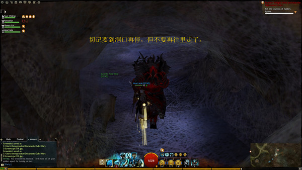 干掉几波蜘蛛后,到达洞穴另一端(很短),这时会分别出现几批次的蜘蛛,AOE群之。不要犹豫,但需要你自己一批一批的引过来,如果你贸然冲进去,全队就要死上了个好多次才能杀干净。图中标示地方就是出现蜘蛛的位置,人物走过去,看到蜘蛛猴迅速退回洞里,拉着杀掉。