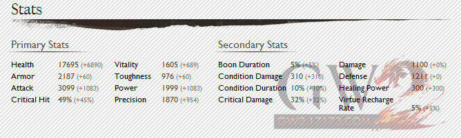 先说一下这套build的特色,在于没武器的限制,而且攻击力在pve满装没boon下也会保持3000+,爆击率50%左右,为何要暴击这麽高,因为有2个技能,可以在你暴击时加上活力和群体might,而且也可以加上暴击发动的符文,有暴力的保证