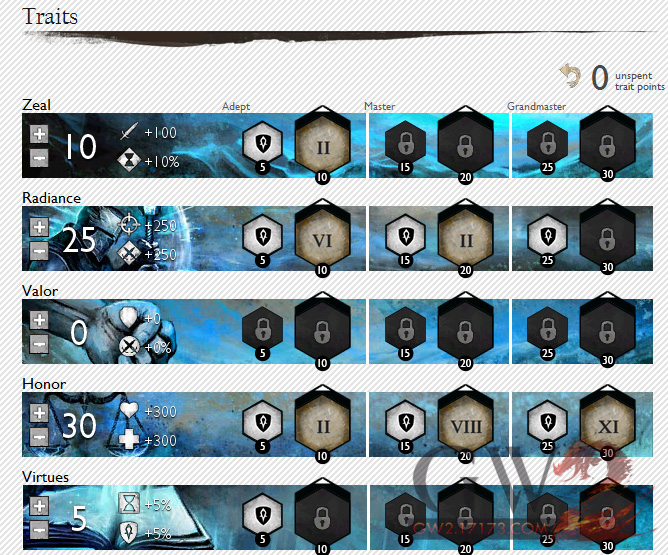 先说一下这套build的特色,在於没武器的限制,而且攻击力在pve满装没boon下也会保持3000+,爆击率50%左右,为何要暴击这麽高,因为有2个技能,可以在你暴击时加上活力和群体might,而且也可以加上暴击发动的符文,有暴力的保证