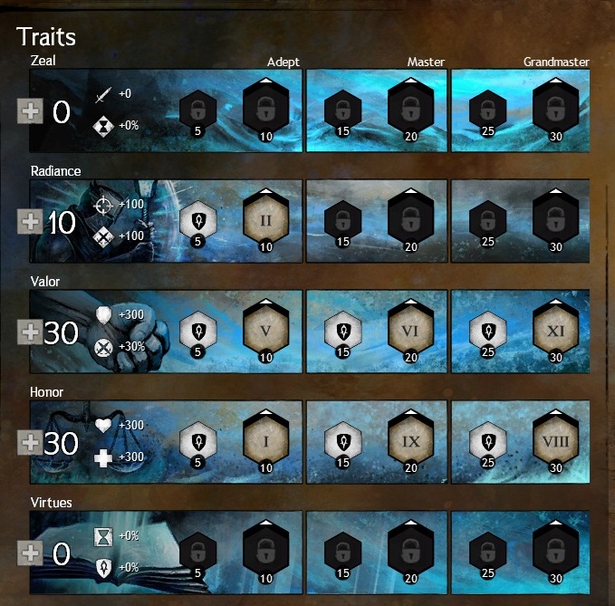 所以我在Radiance上加了10点, 在Valor上选了"Retributive Armor: 5% of Toughness is given as a bonus to Precision"再配合装备,弥补守护的爆击率.
