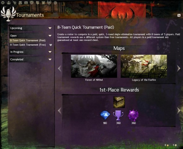 因为你必须有一个完整的队伍并且拥有竞标赛门票才能加入付费竞标赛,同时我们也意识到那些顶尖的队伍也会来玩付费竞标赛,所以,玩付费竞标赛比你玩免费的竞标赛有更好的收益,而且你真正竞技的目的应该是为了排位赛积分!认为自己非常擅长激战2中的sPvP竞技?那么赶紧参赛证明自己的实力吧!我们将会增加更多的东西来完善排位赛积分制度,等QPs建设完成之后,我们又将会给大家带来新的内容。
