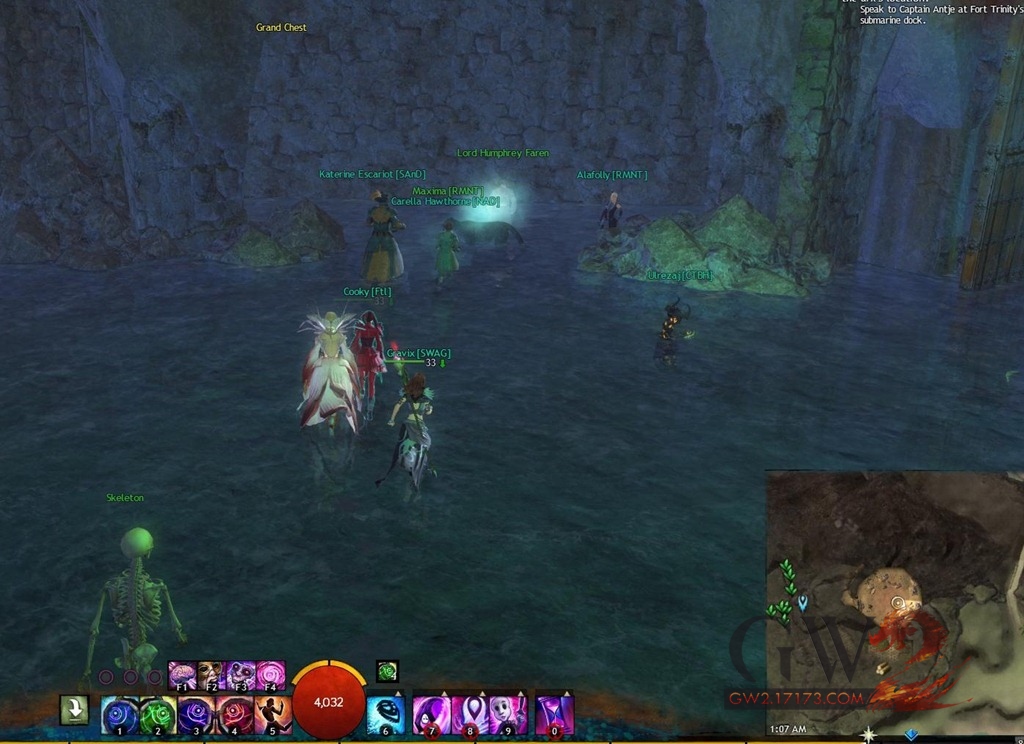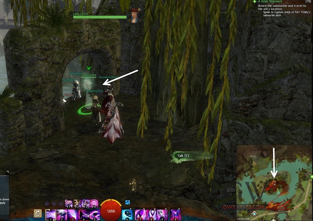 去Lion’s Arch的西北角落,然后跳到水里去,你将会看到污水管道。(游侠抓板鳞鱼的地方,不会走的可以参考这里的视频:点击此处看视频)