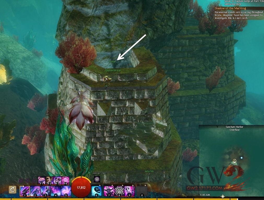 去Lion’s Arch Sanctum Habor,朝地图上的Sanctum Habor位置标识走去。你会看到水里有一个坍塌的塔,使用扫描仪按3扫描,Tynna 就会出现并给你疯王的回忆 III: 稚爱。
