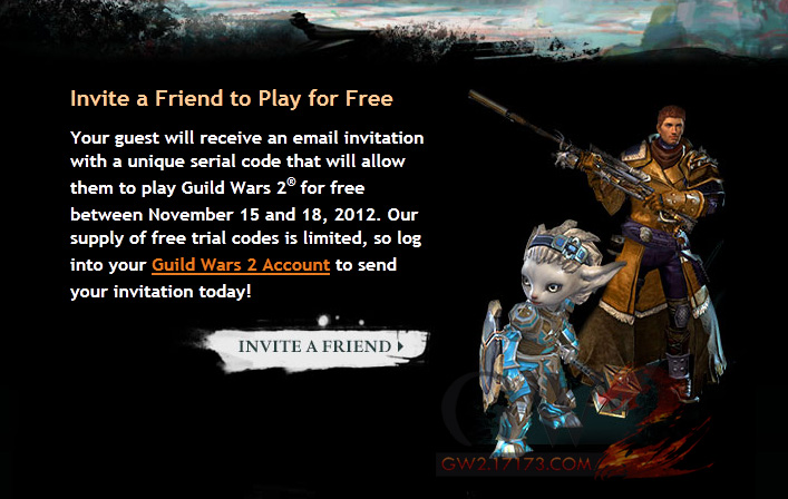 拥有《激战2》账号的玩家应该今天都收到一封邮件,提示你邀请好友免费体验泰瑞亚大陆的活动正式开启,被邀请的好友可以获得三天的免费试玩体验时间(11月15日-18日),点击邮件中的链接就可以直接跳转到官网的活动页面,当然邮件中的链接需要你是美国的IP才能打开,没有VPN的玩家可以直接打开官方网站(www.guildwars2.com)登录来进行邀请步骤。