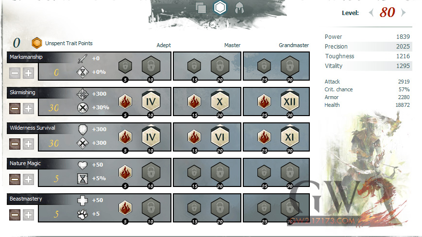 《激战2》高爆发高生存游侠配点,我个人从BWE开始钻研游侠至今得出的Build,战斗全程不断切换武器, 在获得狂怒迅捷同时 (Tail Wind & Furious Grip),靠符文效果保持足够耐力翻滚闪躲 (Sigil of Energy)