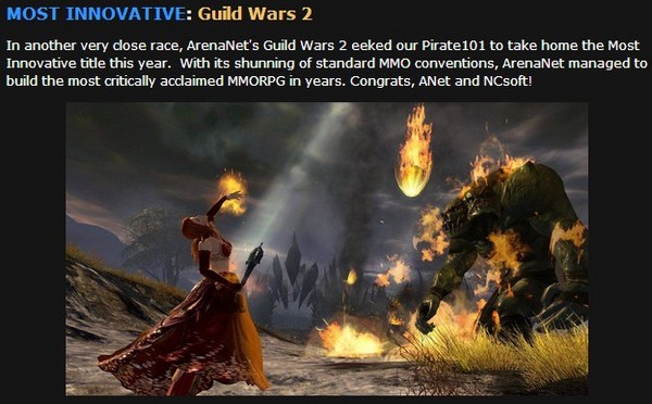 北美著名游戏门户网站——www.mmorpg.com于日前公布了2012年玩家投票选举顶级游戏的结果,此次投票有近10万玩家参与,其中《激战2》凭借其不断创新、颠覆传统的理念,获得众多玩家的支持,最终以压倒性优势摘得“最具创新游戏”桂冠。