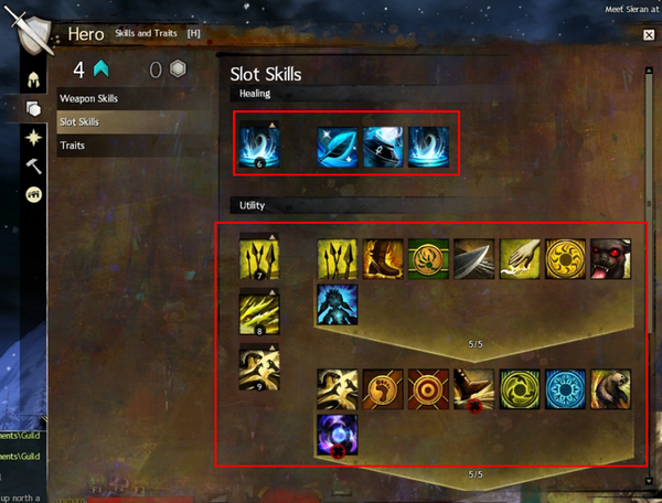 《激战2》的技能分为四种,由武器来决定的技能分别占据前五个技能栏,前三个为主手武器技能,后两个为副手技能,第六个是治疗技能,七八九三个技能栏为通用,即这些技能需要用技能点来激活,这些技能可以决定一个职业主要的攻击方式、战场定位等等。最后一个技能为精英技能,是指相对来说威力较大,CD时间也较长的技能,同样需要技能点来开启。所以《激战2》的前5个技能由你装备的武器来决定,而后五个则在你已学会的职业技能中任意挑选,完全由自己进行组合搭配。