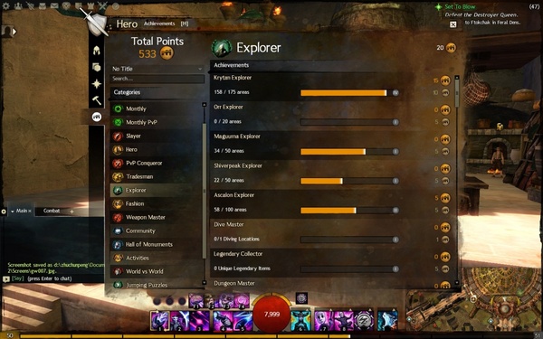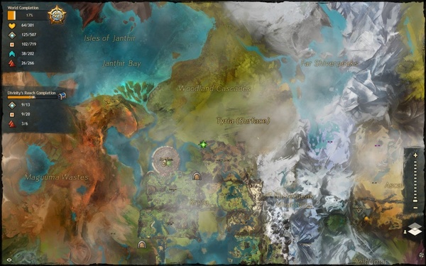 探索地图成就是所有《激战2》粉丝最为喜欢,也最为关注的成就。探索一张地图,需要开启这张地图中的所有传送点,阅览所有的地图碎片,发现所有的隐秘点,每当你完成一小处探险时,你不仅可以享受探索过程中的乐趣,还能能取得相应的成就,在自己的个人成长记录中留下重重的一笔。当你取得一张地图中所有的探索成就时,会收到系统给予的丰厚道具奖励,帮助你在泰瑞亚世界中更好地探险。
