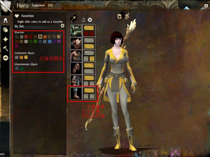 GW2的染色和AION什么的不一样,一个染料用了就在装备上显示了就没了。GW2的染色是解锁一个颜色,就一直有了,不管什么装备都可以随时使用。只有“已装备的防具”才可以染色,武器和饰品不可染。每一个物品最多有四个可染色区(比如一双鞋子可以分鞋子和边染不同的颜色),同一种颜色染到不同的材质上也可能出现不同的效果色。