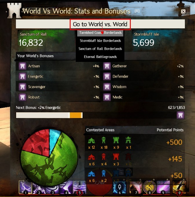 为了省点传送费,可以按B进入WvWvW任意分流服务器,传送到狮子拱门,然后在狮子拱门的种族传送点那进入其他种族的地图。完全免费好嗨皮。