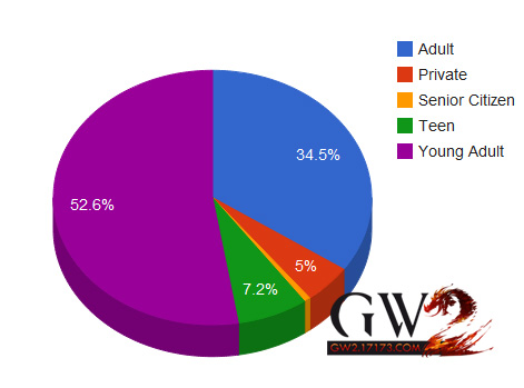 国外网站对于《激战2》服务器人物数据作出了统计,根据数据我们可以看出《激战2》游戏中8个职业的分配比例都比较平均。人类种族选择人数最多,查尔种族选择的人数最少,男性角色比较受到大家欢迎。