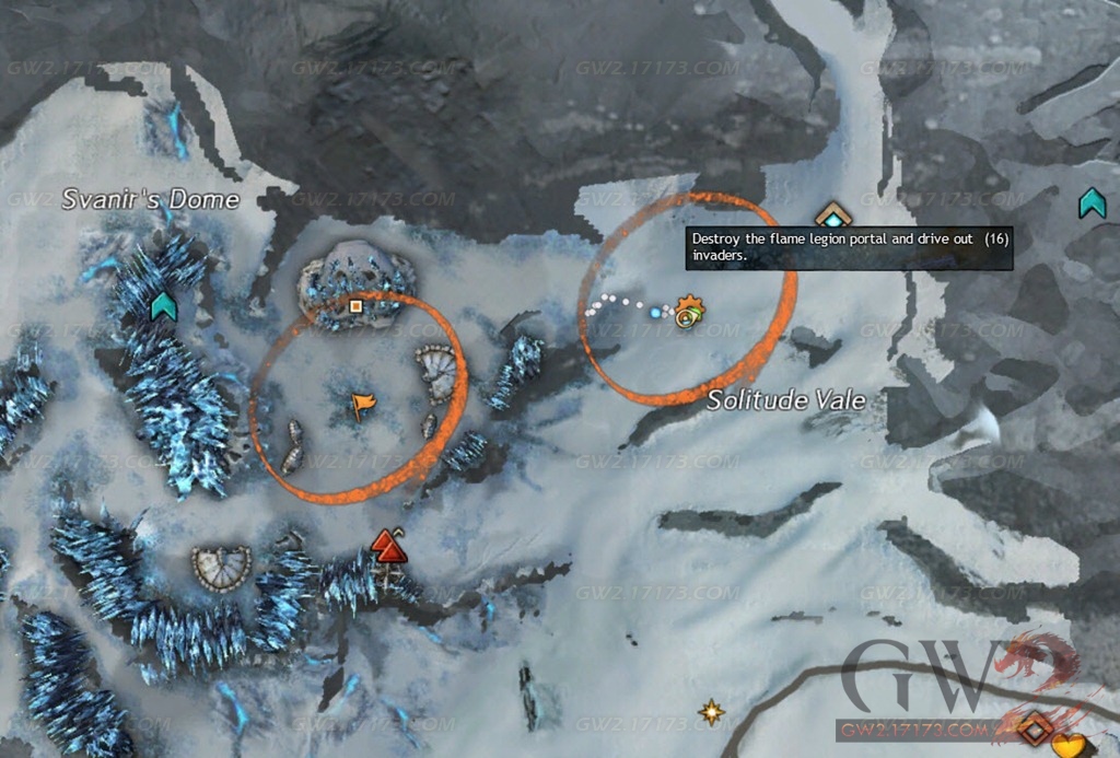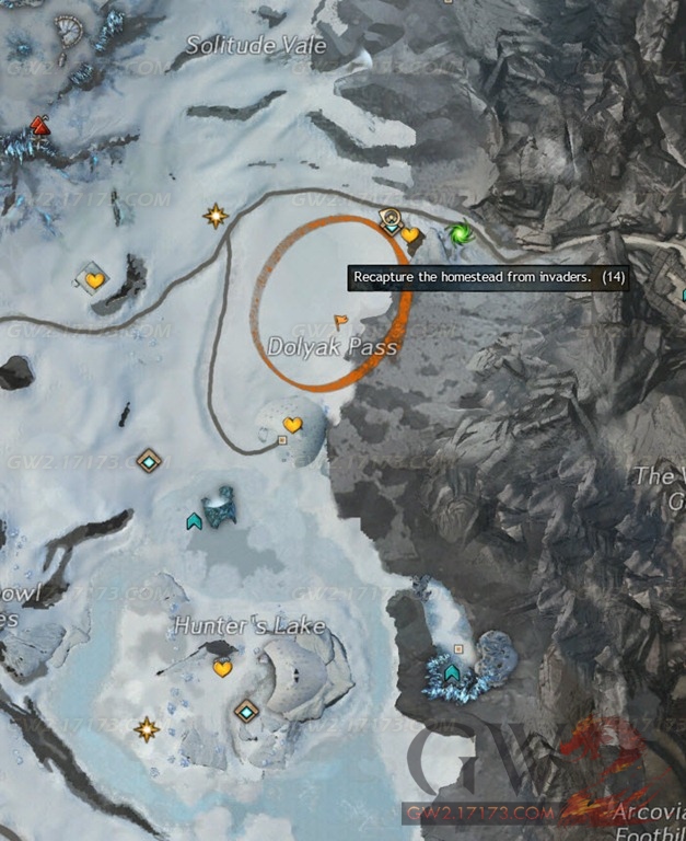 去Wayfarer Foothills东北边的Dolyak Pass Waypoint区域。将会有一个事件需要你击杀一些火焰军团入侵者手并保卫家园。如果事件没有在进行,那么你只要在此次等上几分钟等待事件重新开始。