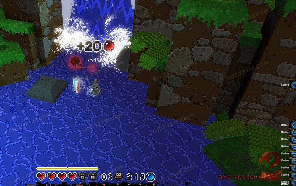 2.收集满上面的8个小装饰品后,到尽头左边找到一个瀑布。这里有一个隐藏房间,可以发现道具“炸弹”。你还可以用铁铲挖取瀑布来获得两个红色的小装饰品,这里总共能获得40个小装饰品。注:铁铲可以在超级冒险盒世界中的商人处购买。