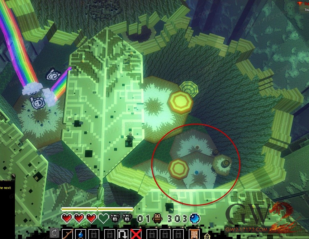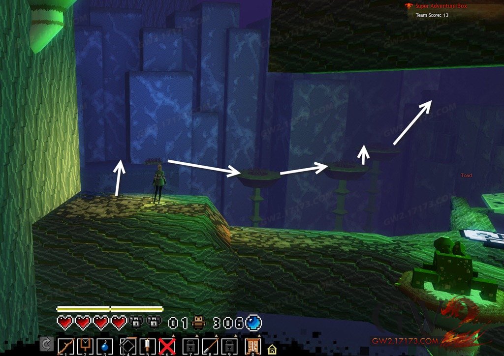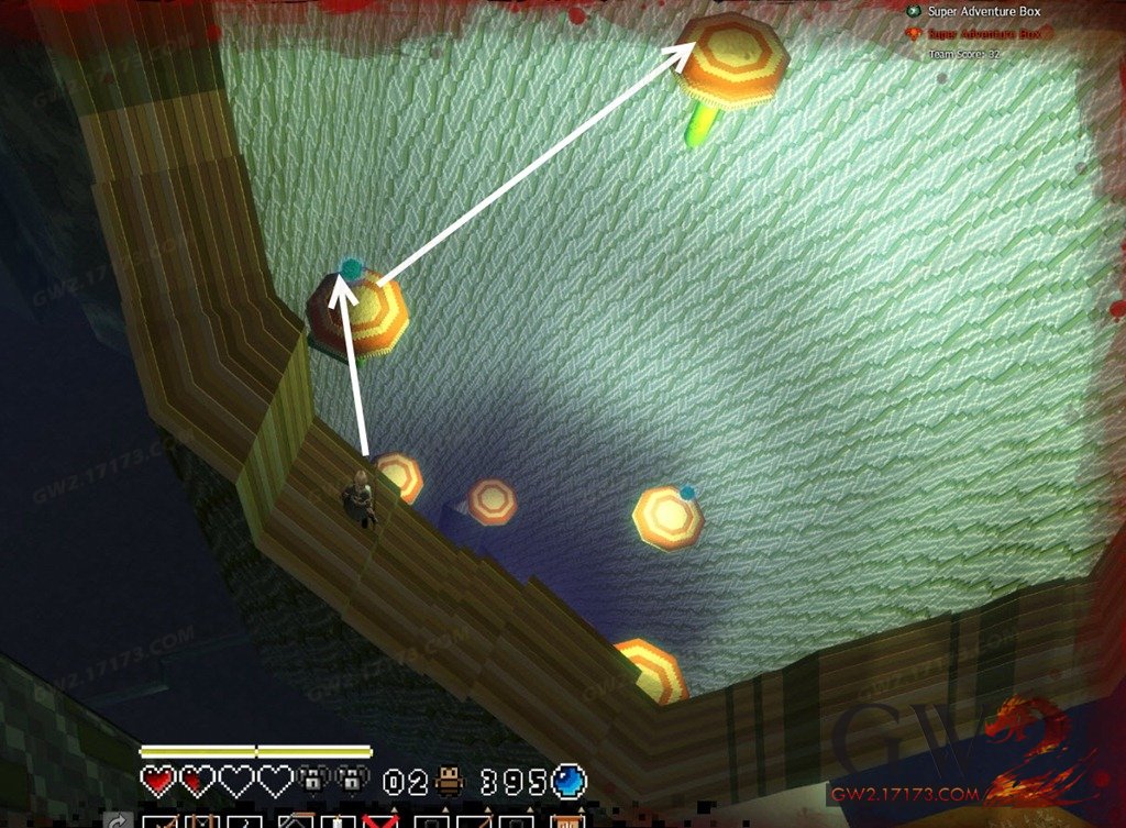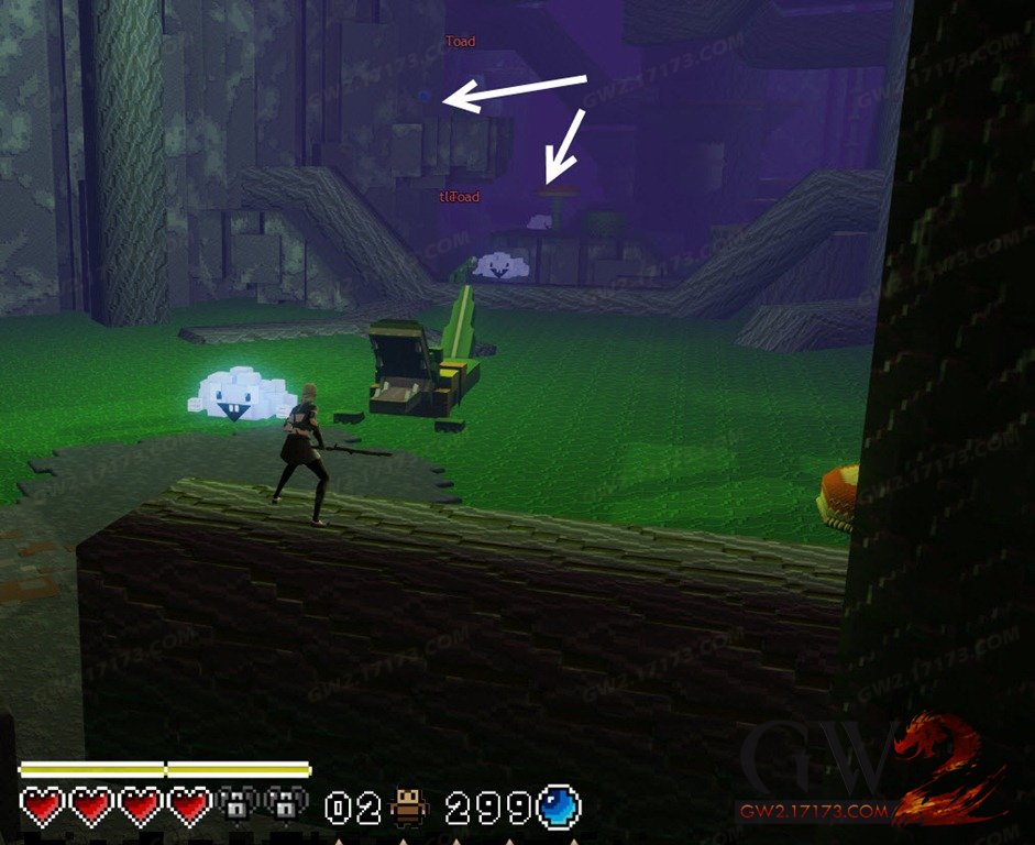 2.用弹跳蘑菇可以到达一个有青蛙守卫的一个平台,这个平台上有一个小装饰品。