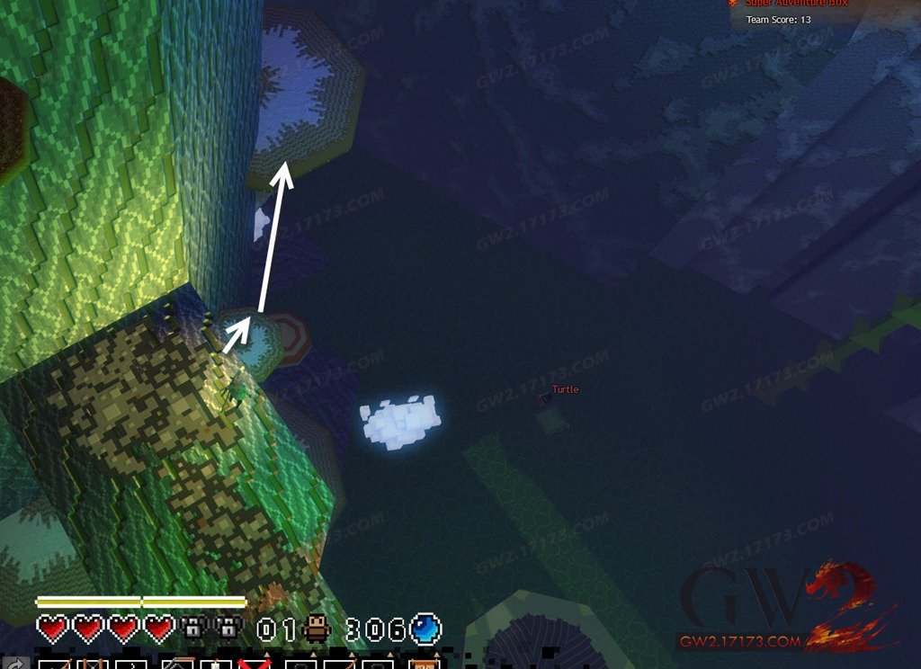 12.出了商店,跳回水里再爬上斜的树干上。开了宝箱(用钥匙或者鞭子开)再到下个一个检查点。