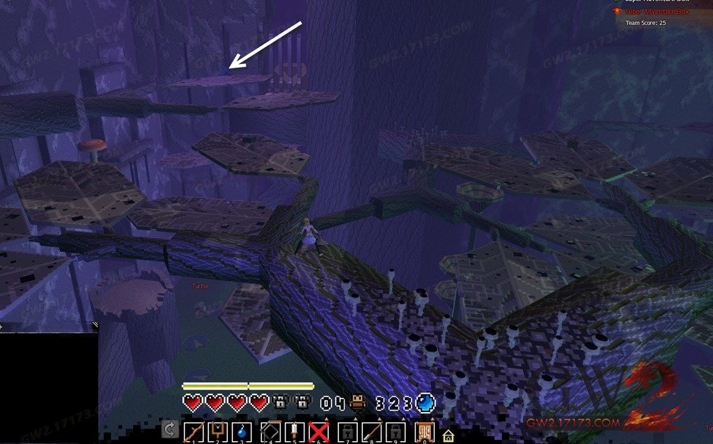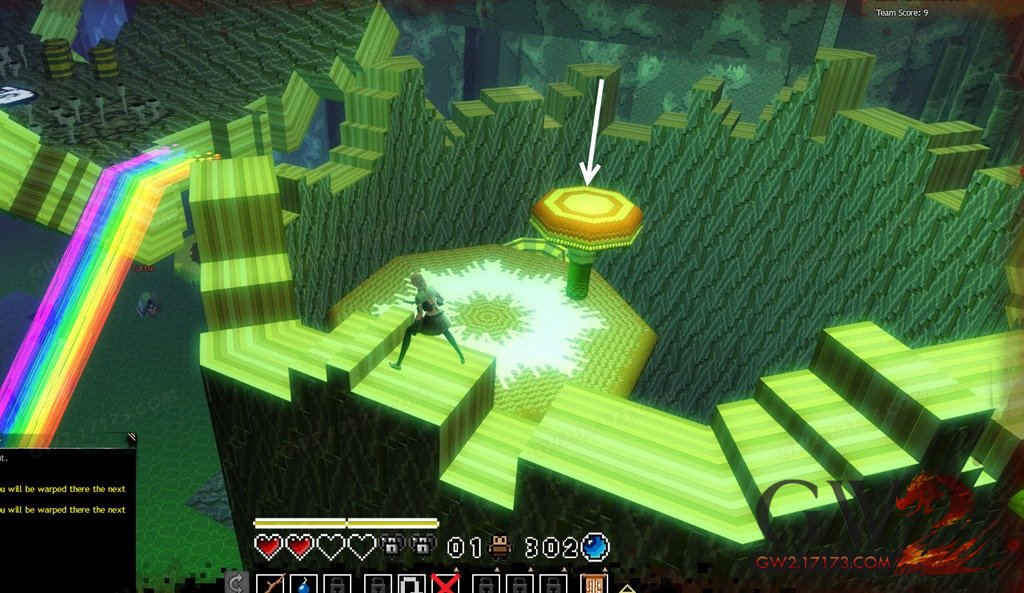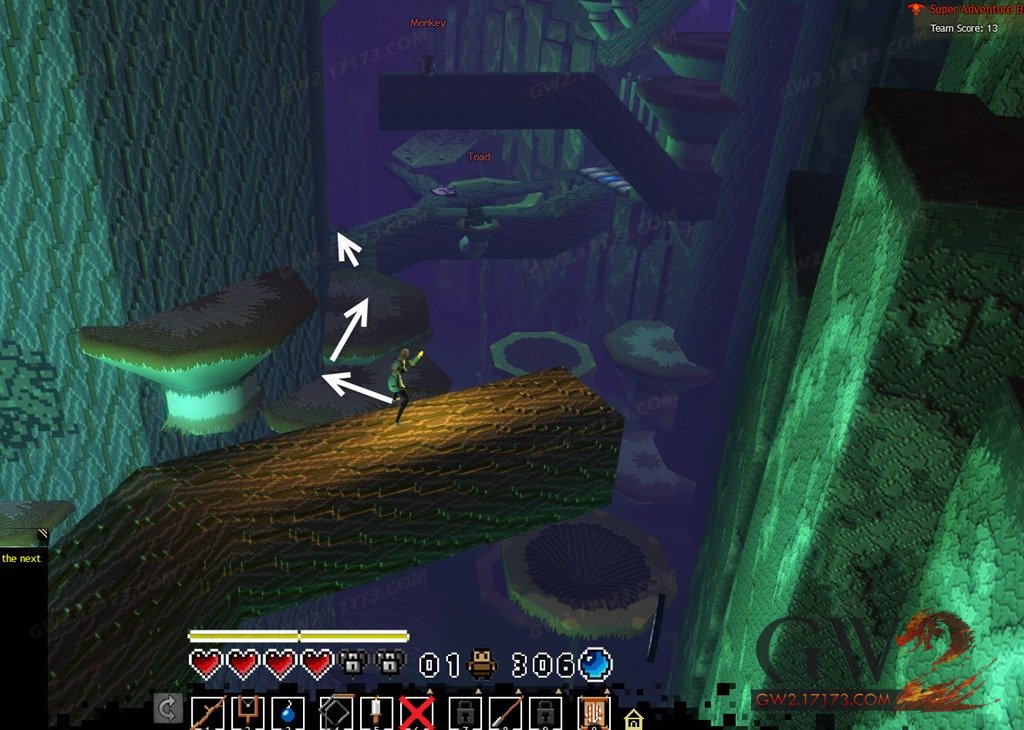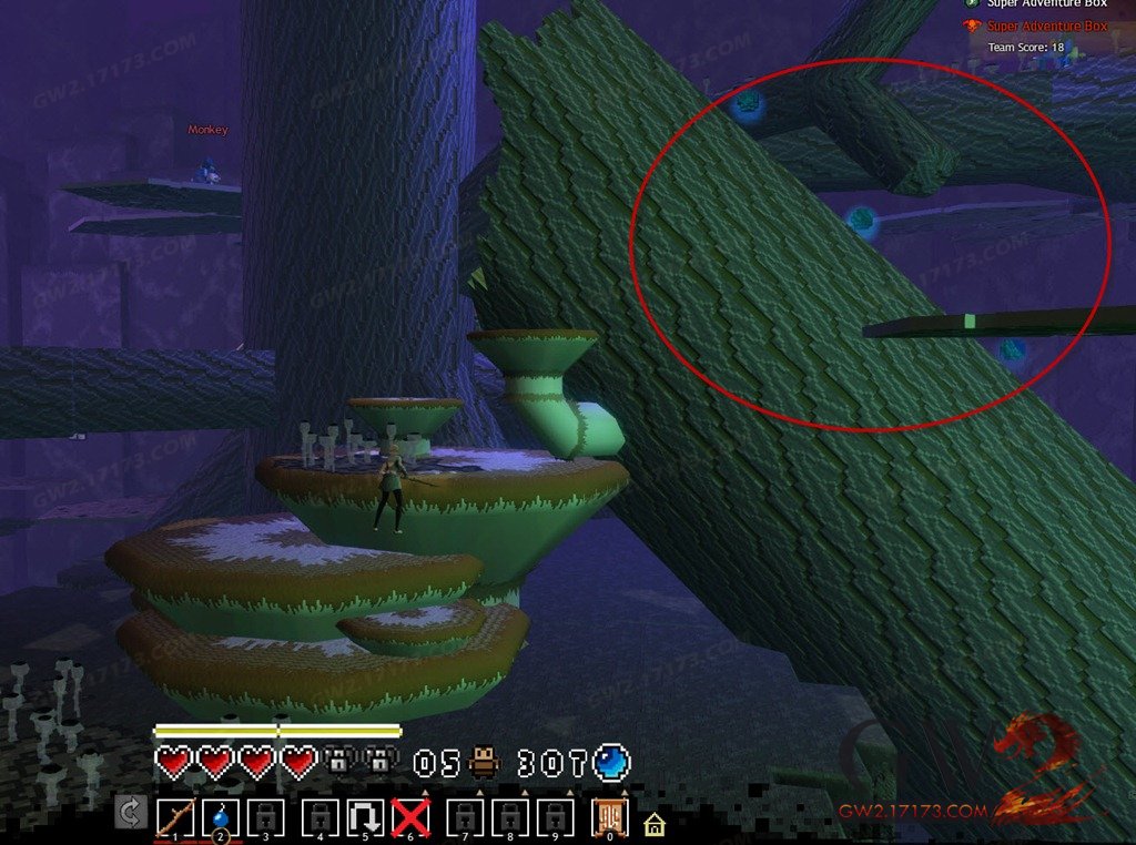 这里可以从树干处直接跳到最顶部的蘑菇。