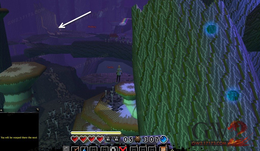 3.用同一个弹跳蘑菇到达树枝处,之后转到这个猴子站的地方。
