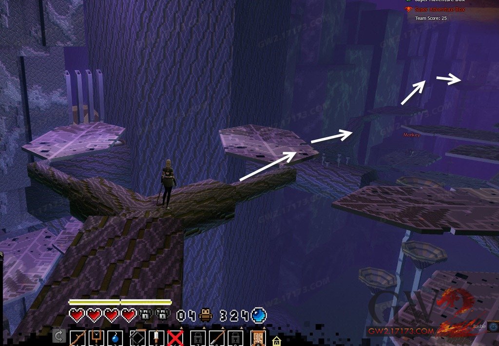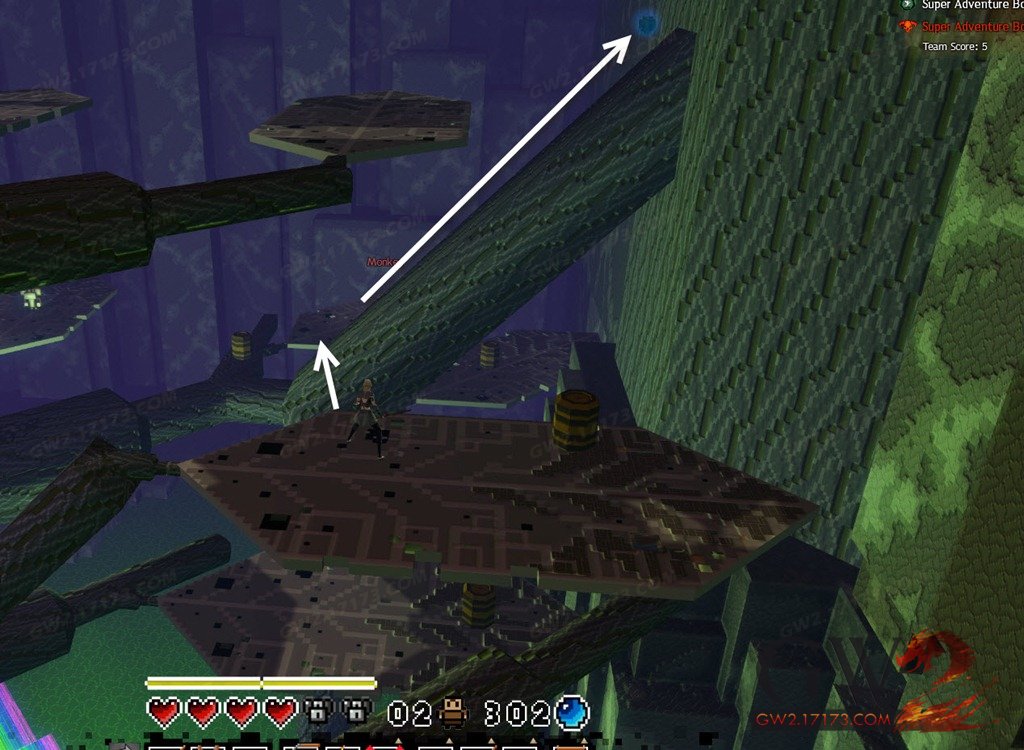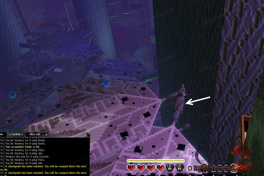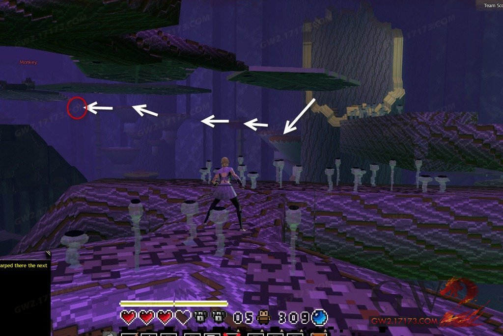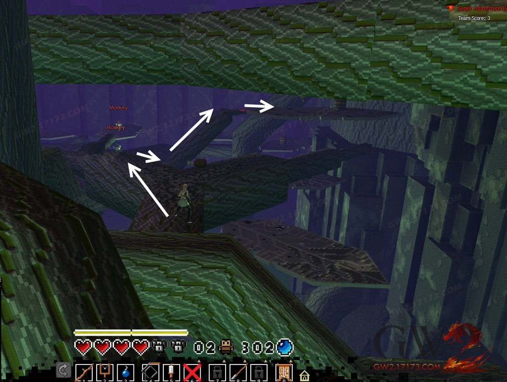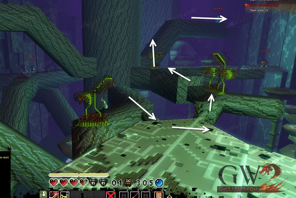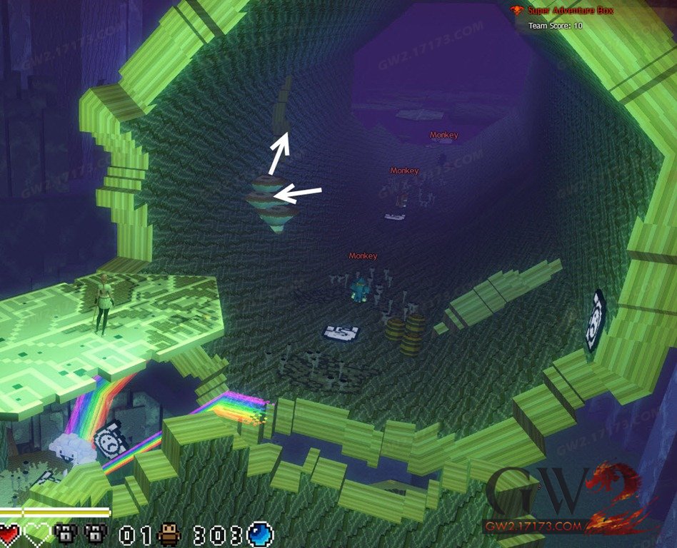 4.拿完这个小装饰品就跳下去,顺着指引去下一个检查站的方向。这里有一个蓝色的猴子将成为你的障碍。
