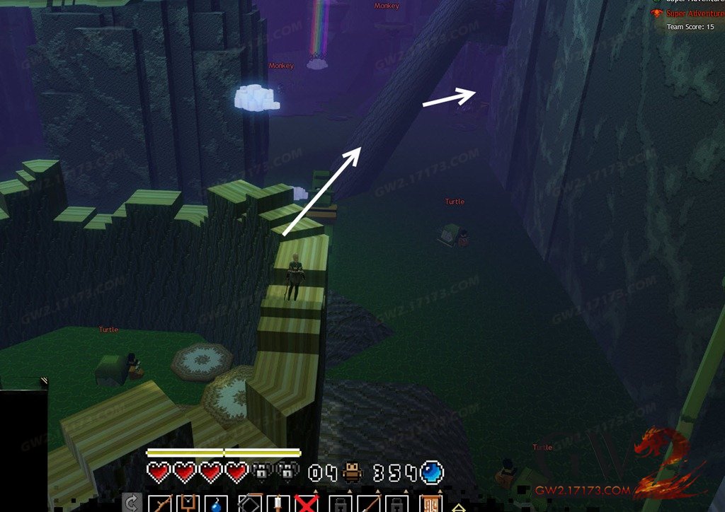 15.这个树干中有5个小装饰品,你必须跳到树干的开口处再进入树干内获取。