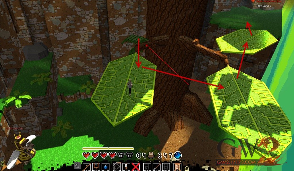 房间内女王对面有一个大树。按箭头位置爬上树根,然后跳到叶子上走到一个长满草的区域,这里你可以发现35个小装饰品。