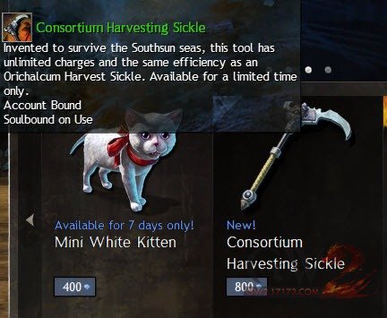 今天美服激战2的黑狮商场再次更新新物品,迷你白猫小宠物和财团采集镰刀。