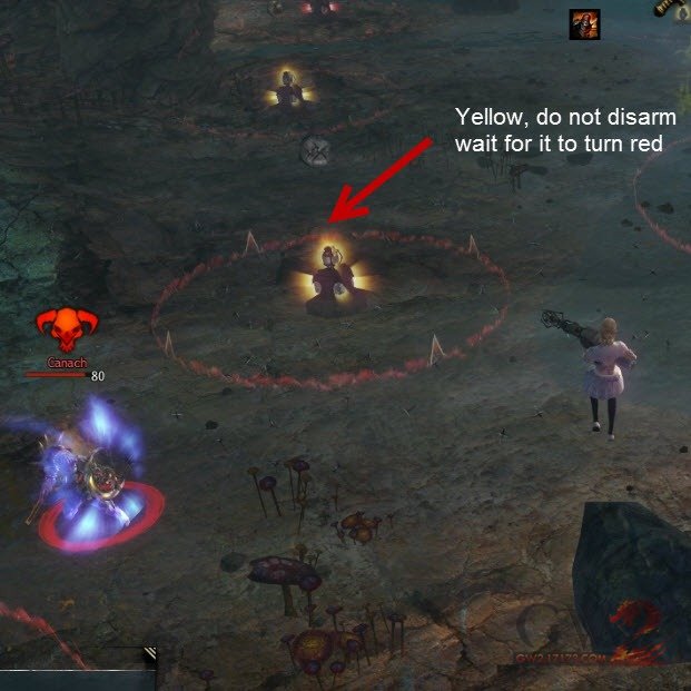 请注意看聊天窗口当卡纳斯准备引爆所有的地雷时将会有警报,这时确保你远离这些地雷。随后这些武装地雷将会爆炸,然后几秒钟后重生。重生后这些地雷将会呈现黄色状态这时它们无法被解除,一段时间后它们将变为红色,这时你可以再次解除它们的武装。