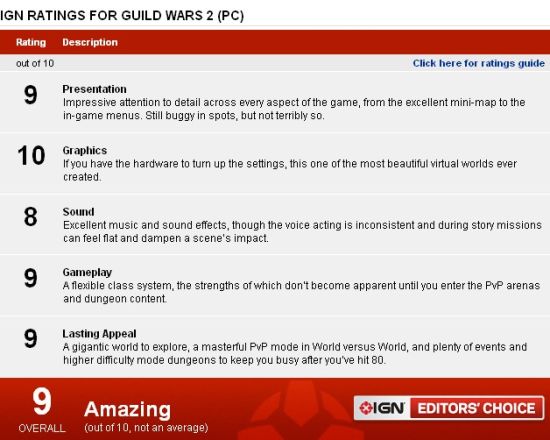 在《激战2》获得IGN2012年度“玩家选择金奖”后没多久,IGN公布了其对《激战2》的游戏评分,竟然罕见地给予一款PC游戏高达9分的超高分评分,其评语足可见对于《激战2》的高度赞赏。