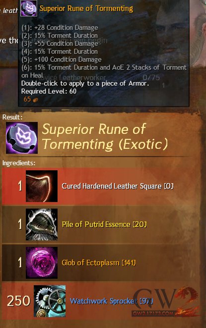 激战2女王周年庆版本中新增了几种印记和符文的配方,而这些配方获取需要在皇家展馆中的NPC处购买,购买不同的配方需要花费不等数量的齿轮(Watchwork Sprockets)和金币,齿轮也是该版本中新增加的制作材料,它可以通过参加女王周年庆中的各种活动获得,例如:皇家展馆中的动态事件、女王挑战赛、热气球塔上的宝箱等等。