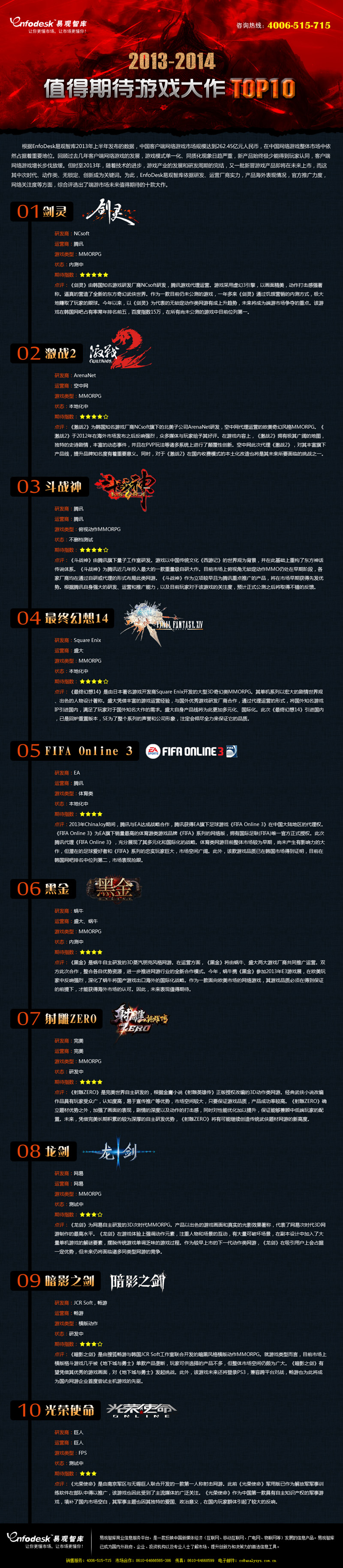 【2013-2014值得期待游戏大作TOP10】易观智库依据研发、厂商实力,产品海外表现等方面,综合评选出了未来值得期待的十款大作:1.剑灵 2.激战2 3.斗战神 4.最终幻想14 5. FIFA Online 3 6.黑金 7.射雕ZERO 8.龙剑 9.暗影之剑 10.光荣使命。