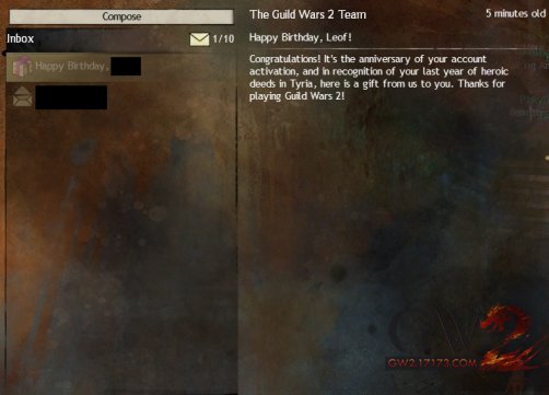 《激战2》第一批角色创建生日礼物已于8月25日发放,2012年8月25日为激战2预售用户优先登入游戏的日子,如果你是预售用户并且当天创建了角色,那么你在2013年8月25日上线时候就可以收到系统邮件,打开系统邮件后就能收到三件生日礼物。