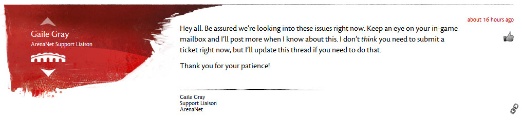 《激战2》即将迎来开放的第一周年,8月25日开始已经向广大预售玩家发放生日礼物,但是有人表示他符合资格但没有收到礼物,官方人员Gaile Gray表示这个确实存在一个bug,目前问题已经被发现,即将进行解决。虽然生日礼物可能会有一些延迟,但是每个人都能够获得生日礼物的。