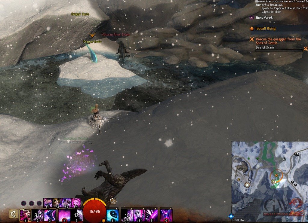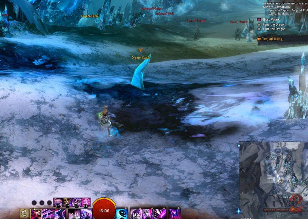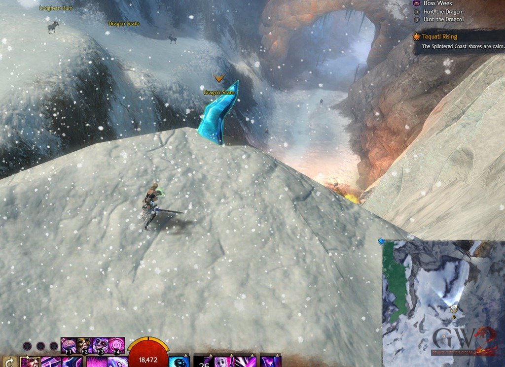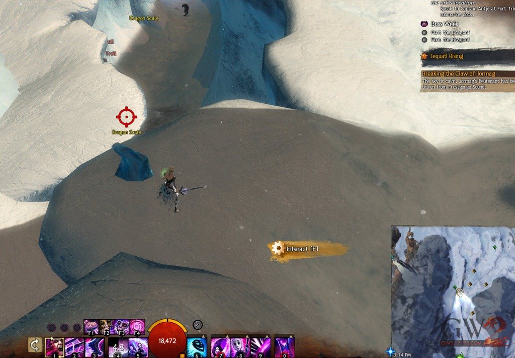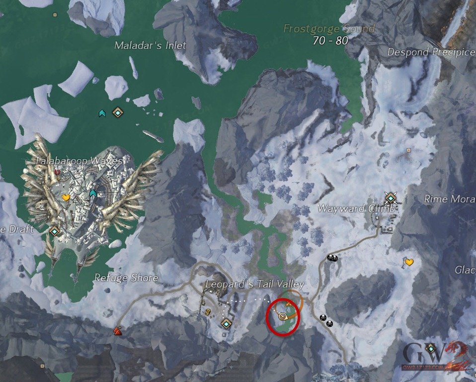 《激战2》本次“吞噬托”崛起版本更新中添加了9个BOSS周系列成就,成就中可以完成5个,其余4个可以通过每日成就完成。BOSS周系列成就其中三个是要求你去三张有巨龙刷新的地图寻找巨龙的遗迹,本篇介绍霜谷之音(Frostgorge Sound)寻找冰霜巨龙鳞片的具体攻略,这张地图是冰霜龙存在的地图,在本地图中你总共需要去10个区域寻找10个巨龙鳞片才能完成成就。