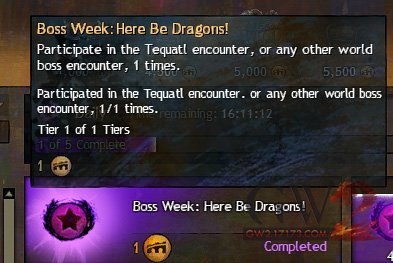 《激战2》本次“吞噬托”崛起版本更新中添加了9个BOSS周系列成就,成就中可以完成5个,其余4个可以通过每日成就完成。BOSS周系列成就其中三个是要求你去三张有巨龙刷新的地图寻找巨龙的遗迹,另外个是比较简单的寻找巨龙足迹和与萝克斯会面。