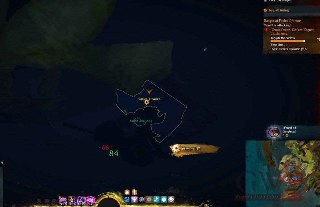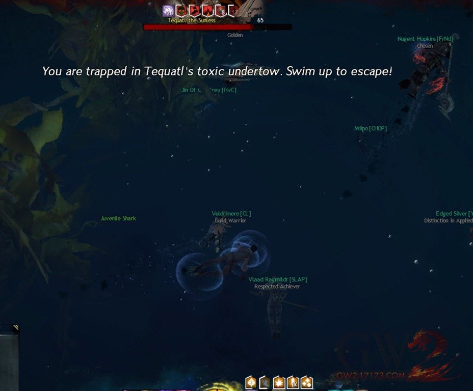 当你将僵尸龙的血量击杀到75%以下时,它将开始召唤漩涡。如果你被其卷入水下,你可以在黑暗的水底往下游找到一个凹陷的宝藏,开启宝箱后可以获得成就。确保你拥有一个治疗技能可用,因为在水下你的血量会持续减少。
