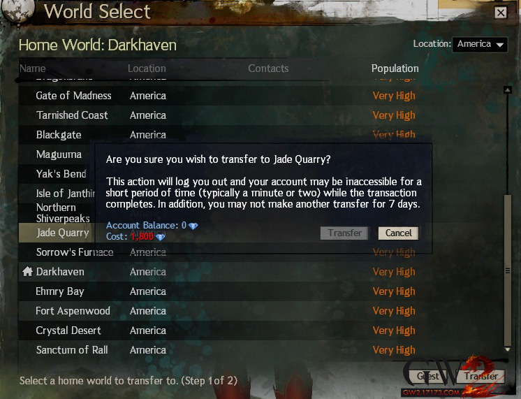 为了迎接《激战2》首届世界之战季赛的开启,从即日起至季赛开始的前一天(10月17日)止将下调转服费用!现在将账号转移到一个中度负载的服务器是免费的,转移到高度负载服务器的花费为800宝石,但是这一促销只维持到10月17日,需要转服的玩家可以开始行动了。