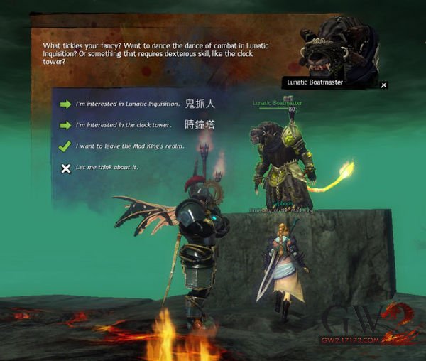 进入疯王领域寻找NPC对话选择第一项进入狂人审判庭游戏,选择第二项进入钟塔跳跳乐活动,选择第三项返回狮子拱门。