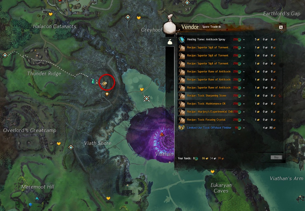 首先你必须完成凯席斯山脉地图上的马乔里给予的任务,任务要求你收集50个剧毒孢子样本。在完成任务后马乔里会变成一个商人,这时你可以使用孢子样本加上一些金币购买相应的配方。