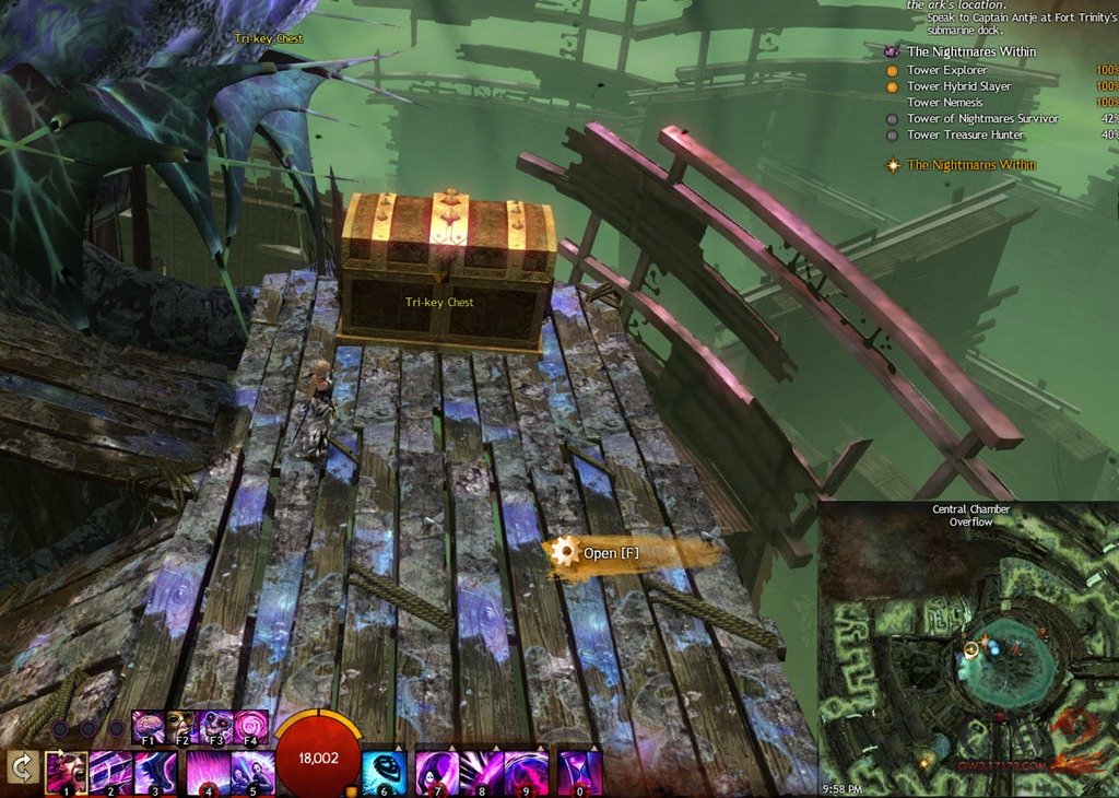 这次的《激战2》噩梦深处版本中添加了一个三钥匙孔宝箱,玩家必须收集三种颜色的钥匙然后合成一把钥匙套件来开启宝箱,宝箱位于噩梦之塔内部的塔顶位置,开启5次三钥匙孔宝箱还能解锁一个成就。