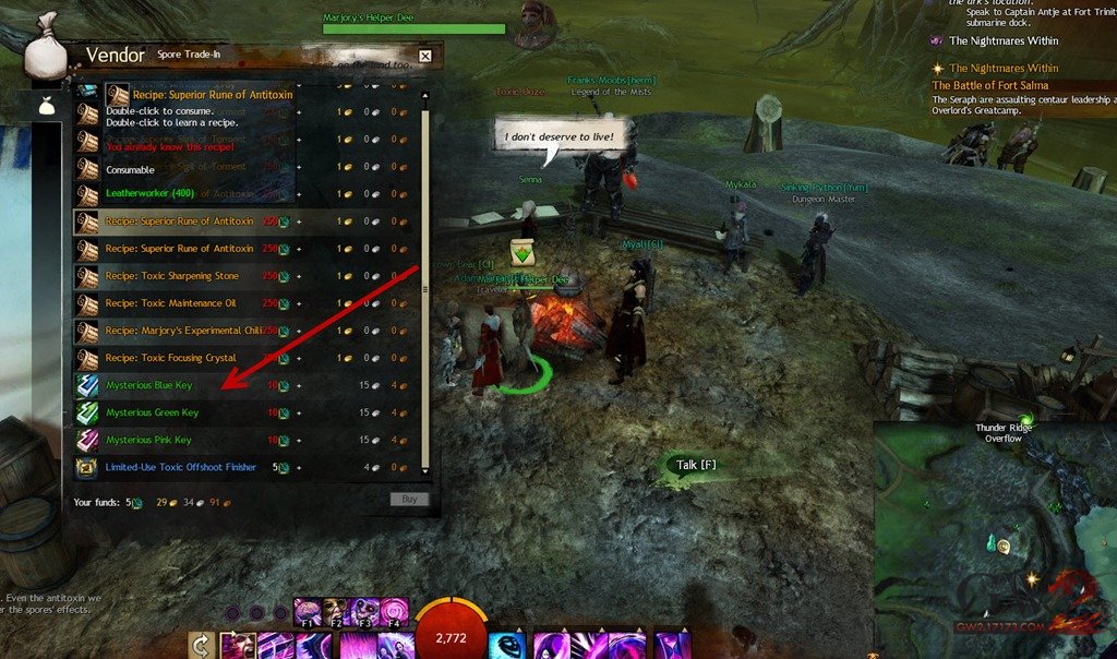 钥匙购买商人位于凯席斯山脉的噩梦之塔西边,当然你必须完成了采集剧毒孢子样本的前置成就,这个是之前版本中的成就,要求先收集50个剧毒孢子样本给玛乔丽。