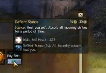 所有的姿态特性都会影响它,将吸收所有伤害(包括直接伤害和症状伤害),然后将受到的伤害治疗自己。基础姿态持续时间是3秒,添加特性将会增加到3.75秒。有一个基础的治疗量,所有你就算操作失误,它还是能为你治疗一些血量。通过它也能减少痛苦和跌落伤害。注意不要用Endure Pain与Defiance Stance一同使用。