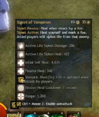 Signet of Vampirism的被动纹章技能,每次击中目标将给予治疗,内置cd为1秒,每次攻击的治疗量约为300。