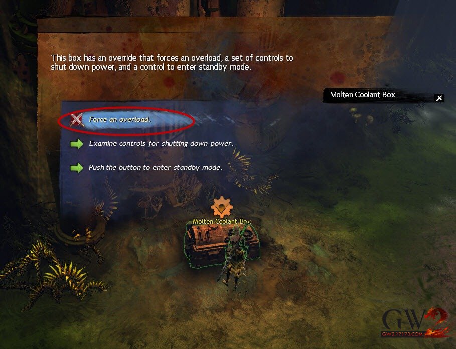 强迫其过载,并消灭刷新出来的小怪,别忘记了收集小怪掉落的废铁。