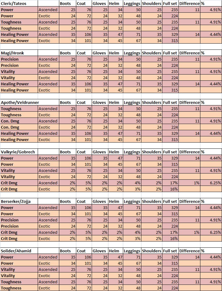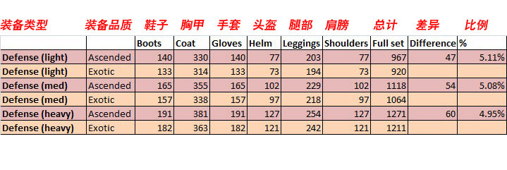 激战2粉装防具部件与橙装防具属性对比的差异大约为5%,鞋子和手套部件上的差异较小,但是在胸甲和腿部属性上的差异较大,整套属性统计后差异大约在5%左右。