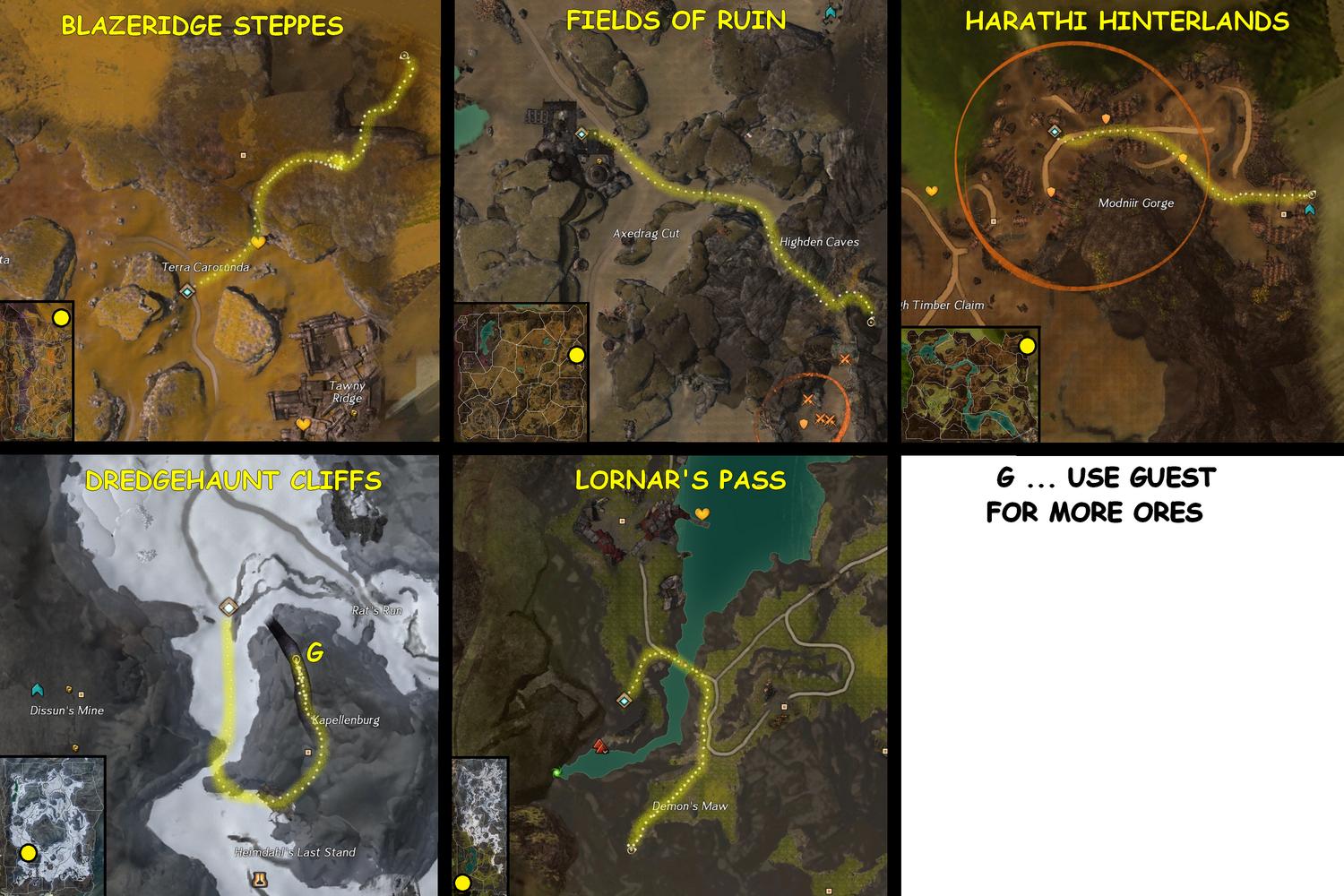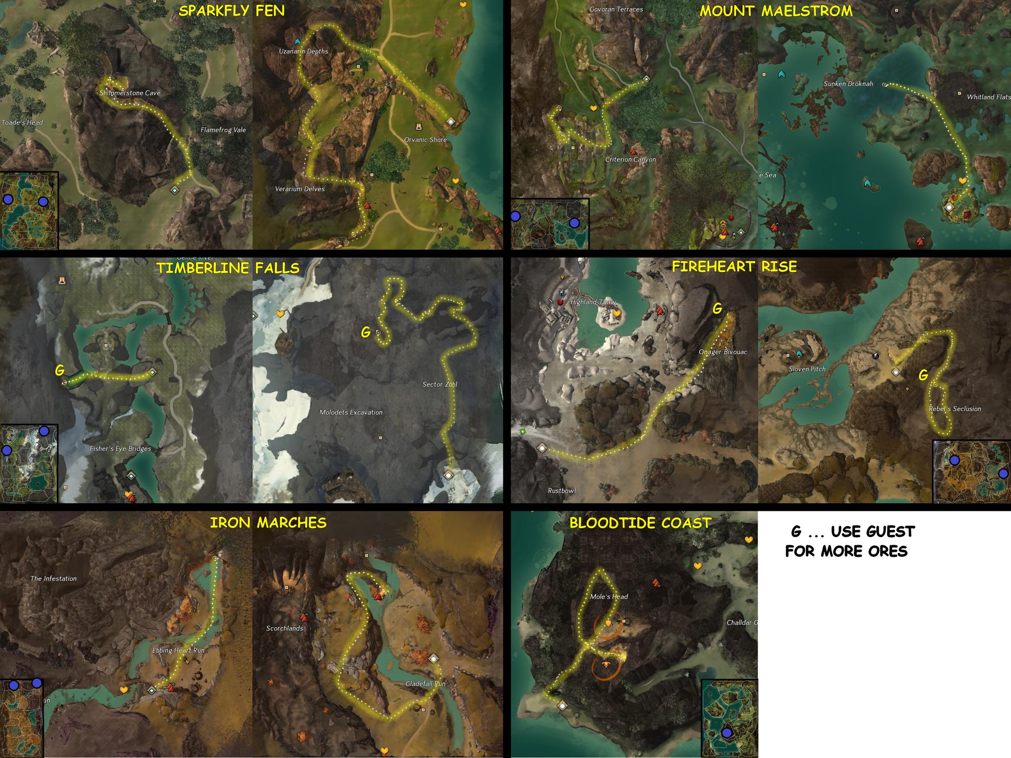 《激战2》中可以在野外采集到制作材料,通常来说这些材料的采集点都是随机刷新的,但是玩家jetti91发现了游戏中拥有几个固定的富有矿源采集点,而这些富有的矿源每次都能采集上10次,并且你可以做客到其他服务器上在相同的地点再次采集。这样一来大大方便了制作材料的采集需求,接下来让我们来看看这些矿源的具体分布。